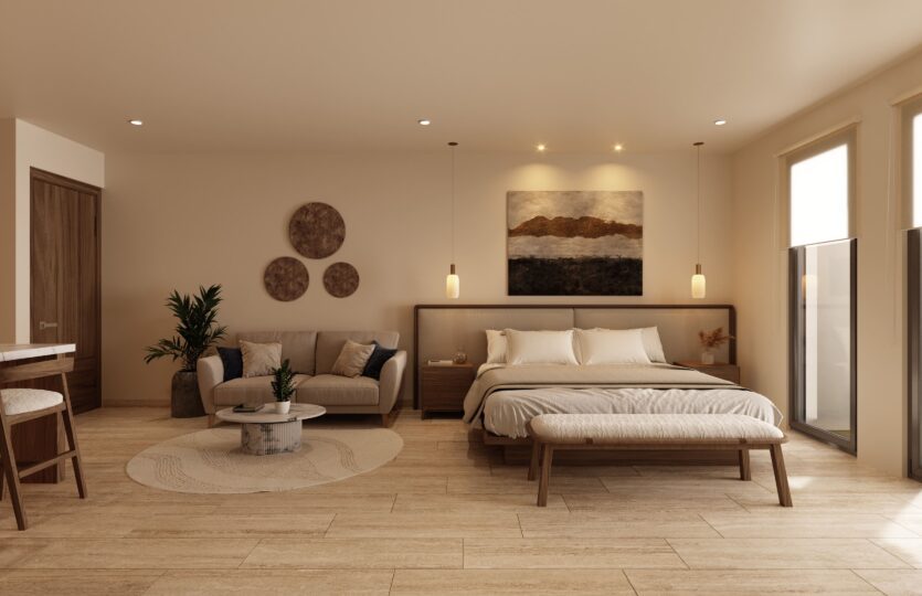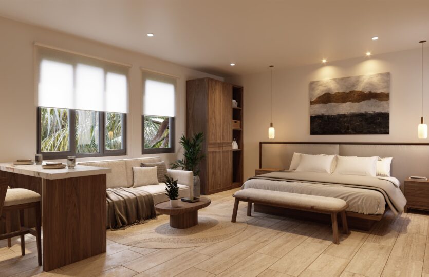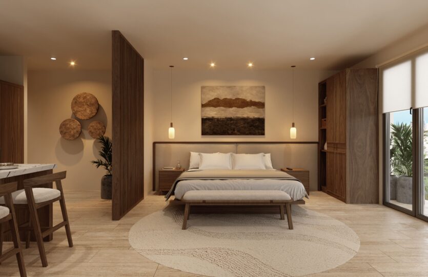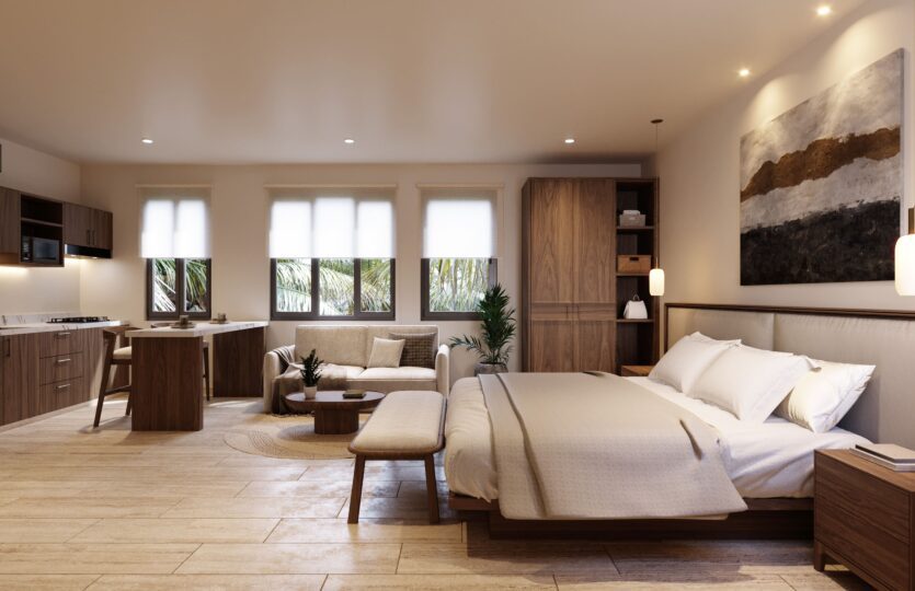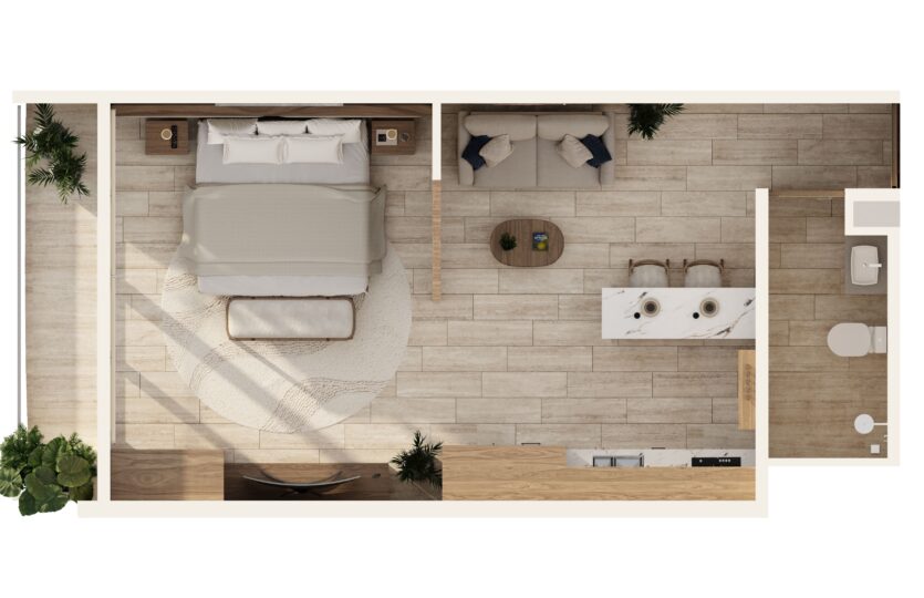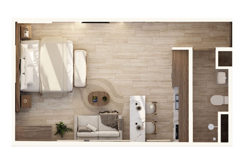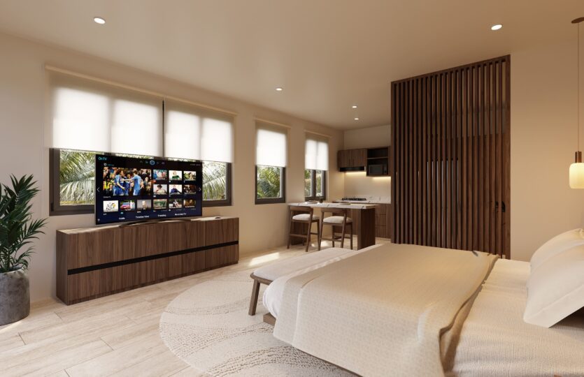 Each 43 m² studio is thoughtfully designed to maximize space and comfort, blending contemporary style with practical living in one of the most sought-after areas of the Riviera Maya.