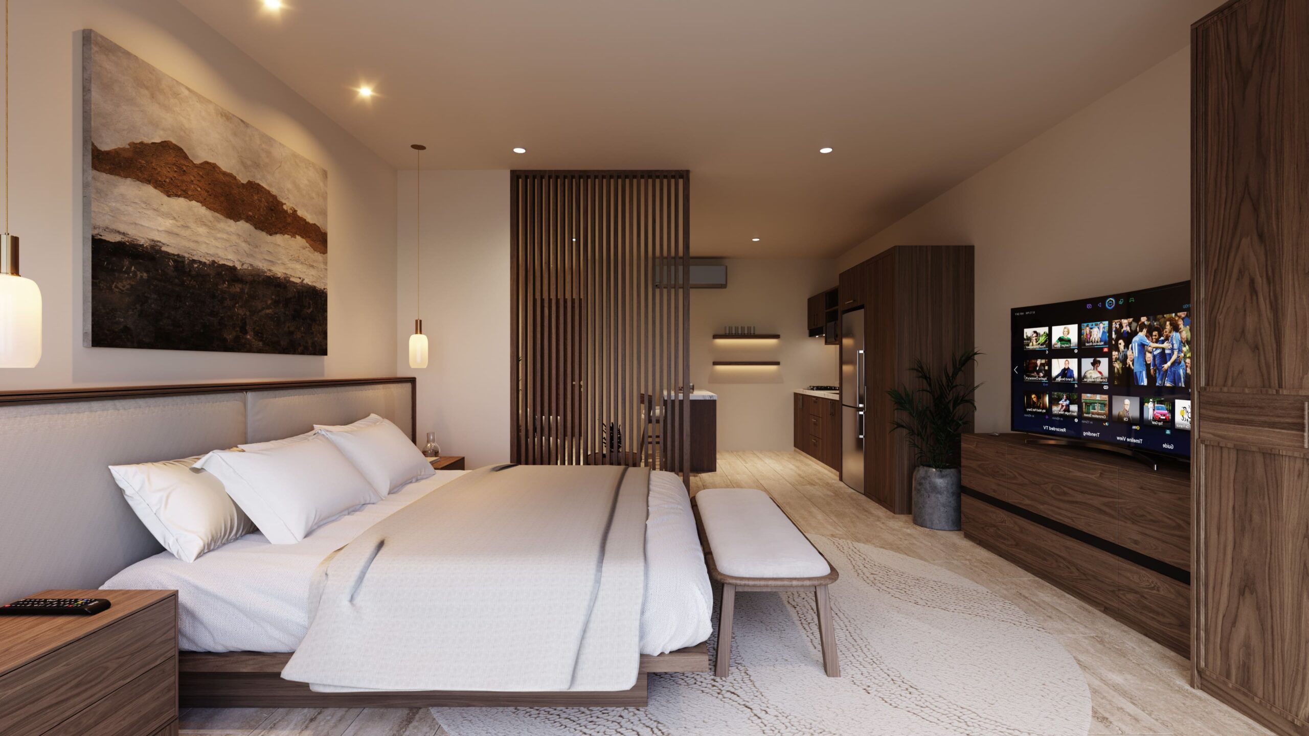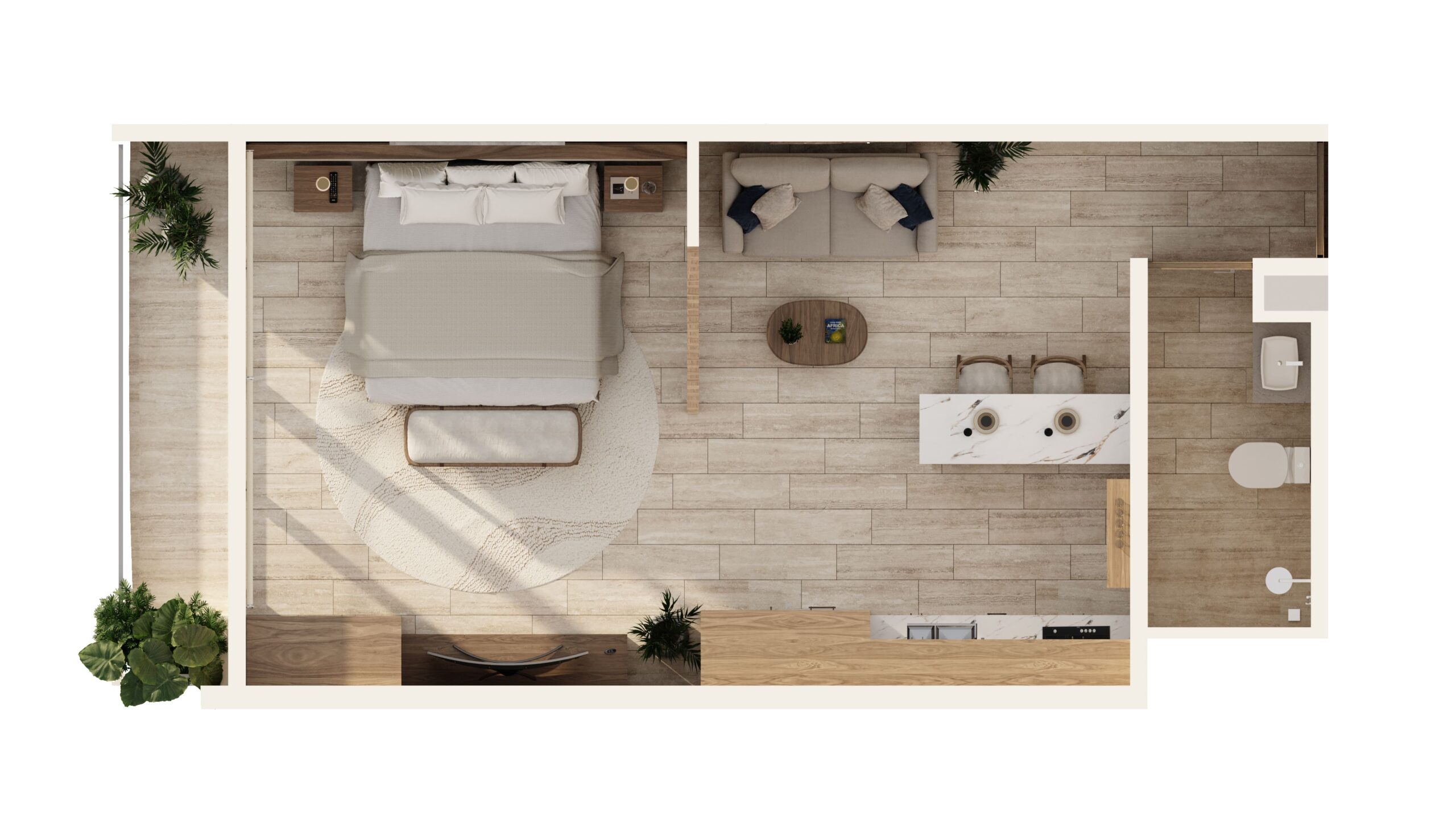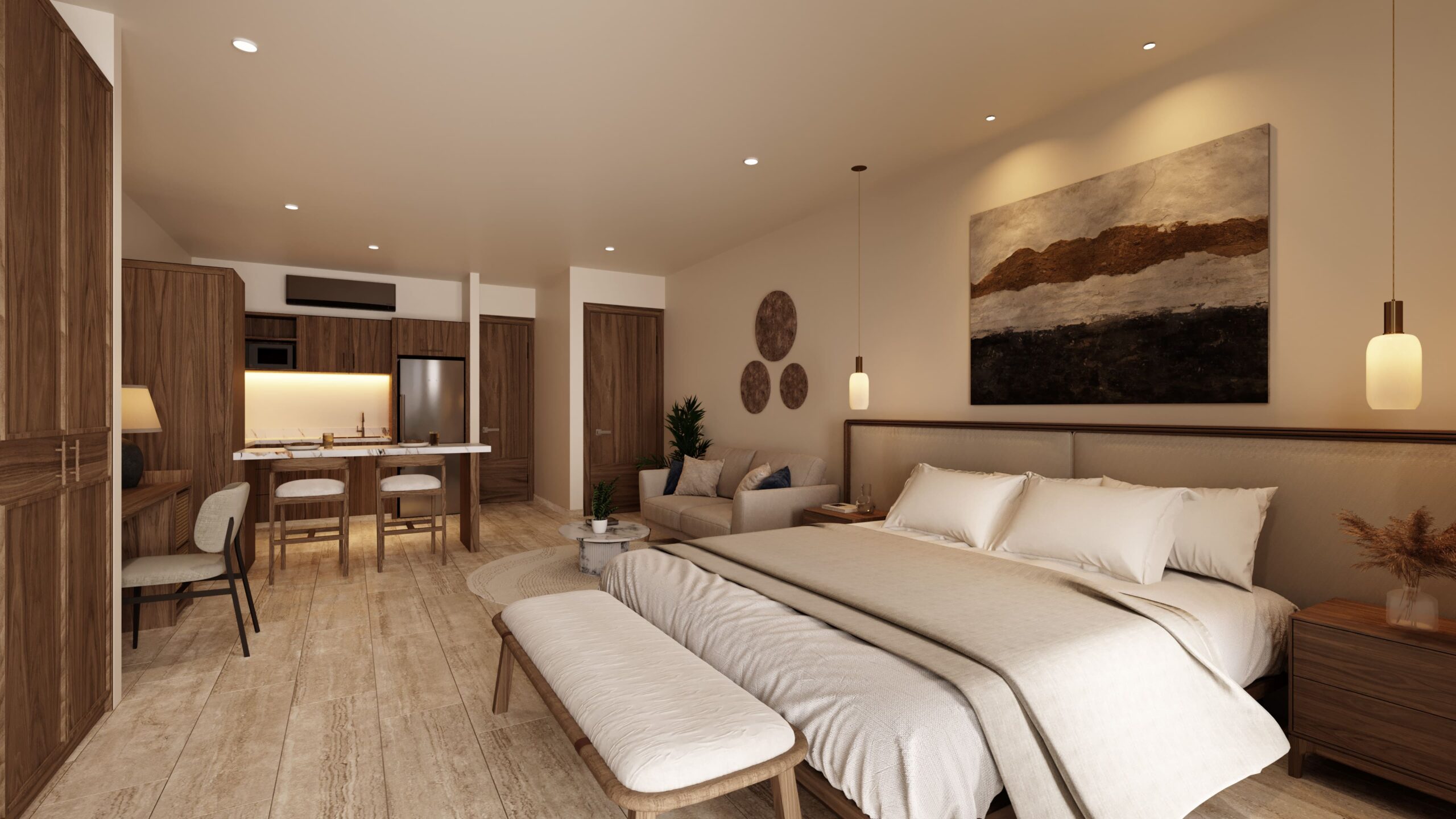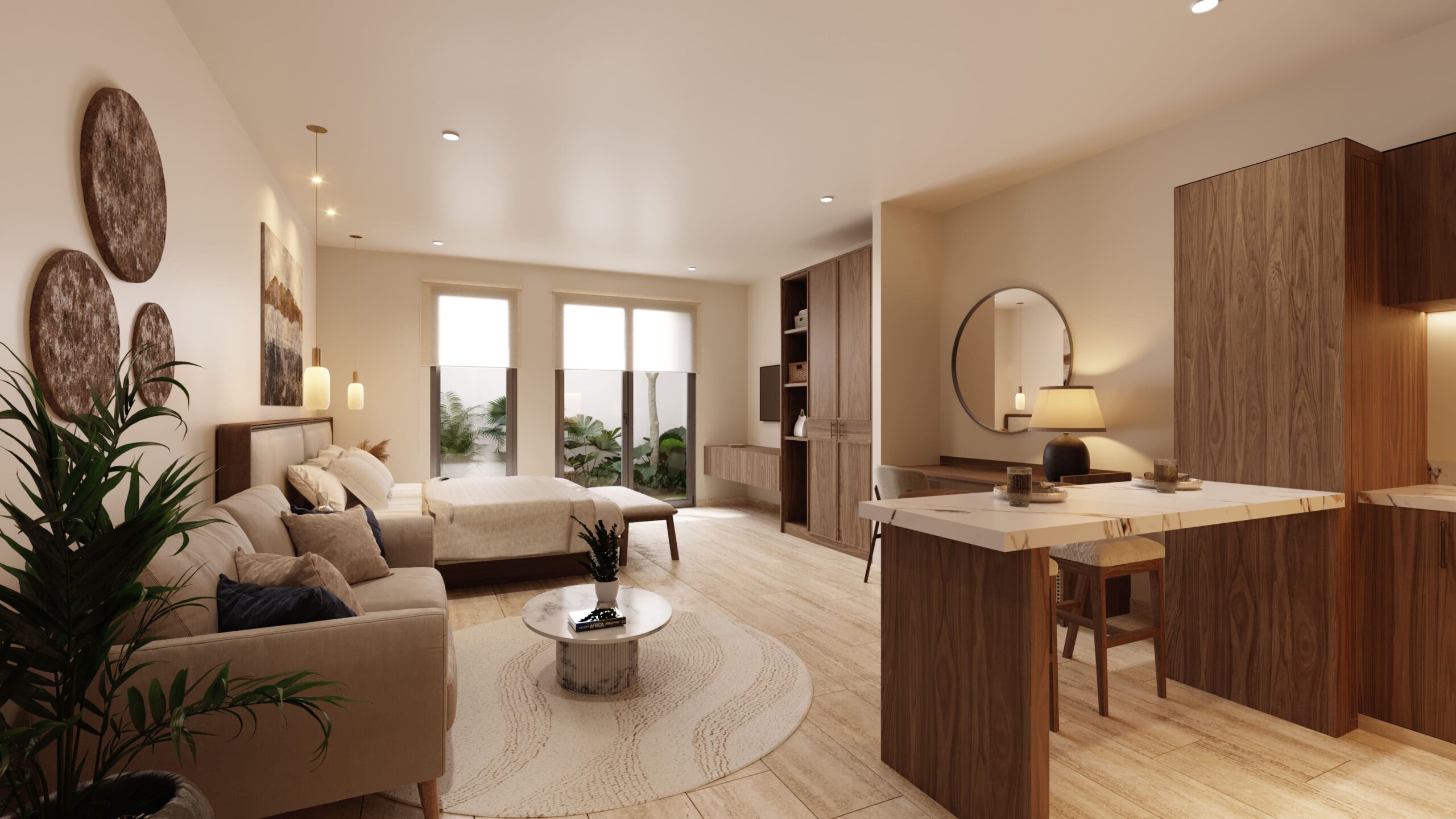 Each 43 m² studio is thoughtfully designed to maximize space and comfort, blending contemporary style with practical living in one of the most sought-after areas of the Riviera Maya.