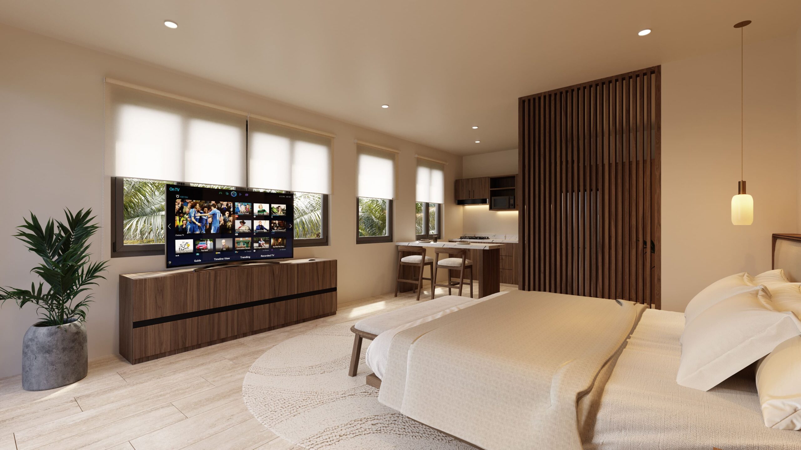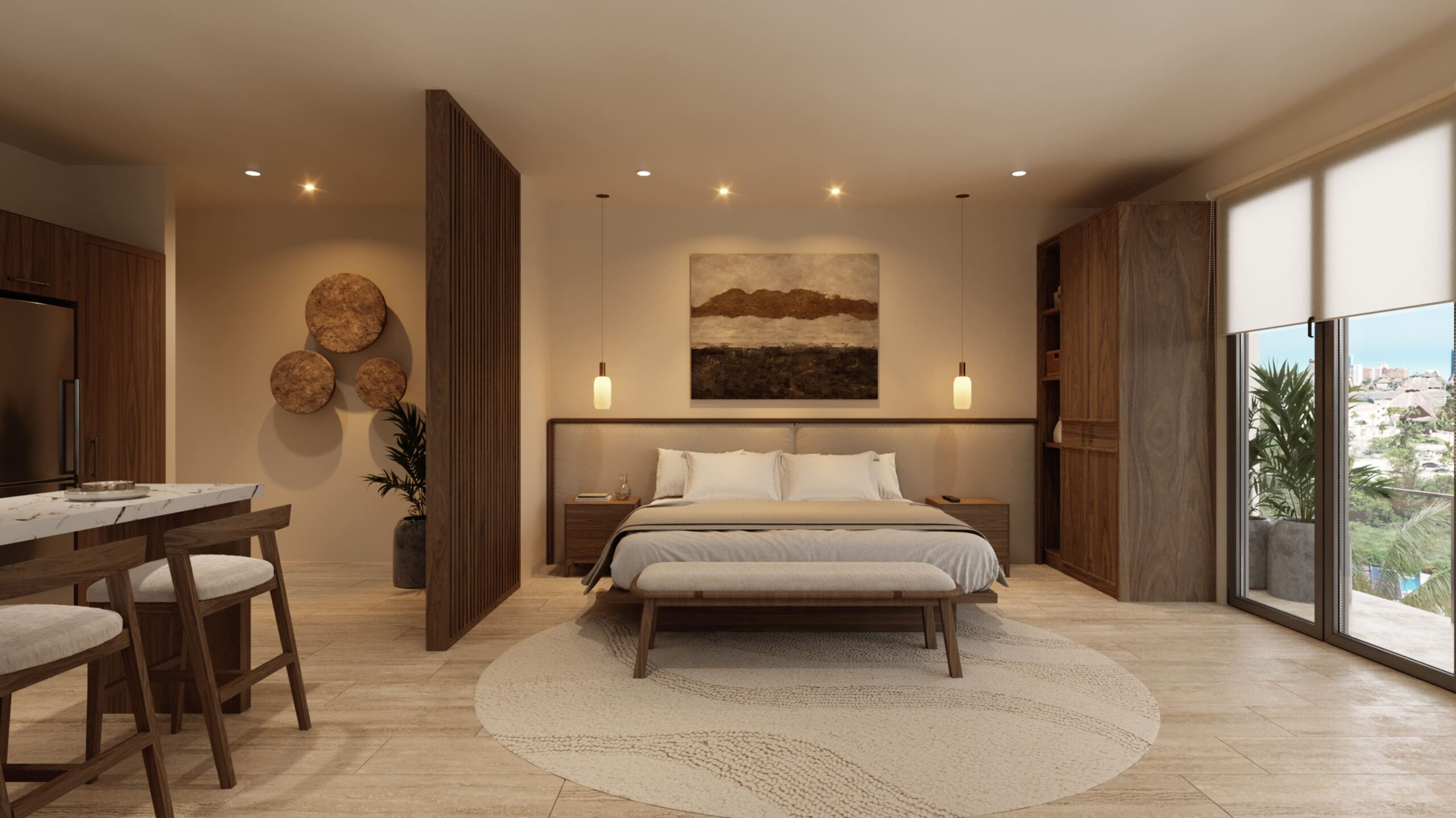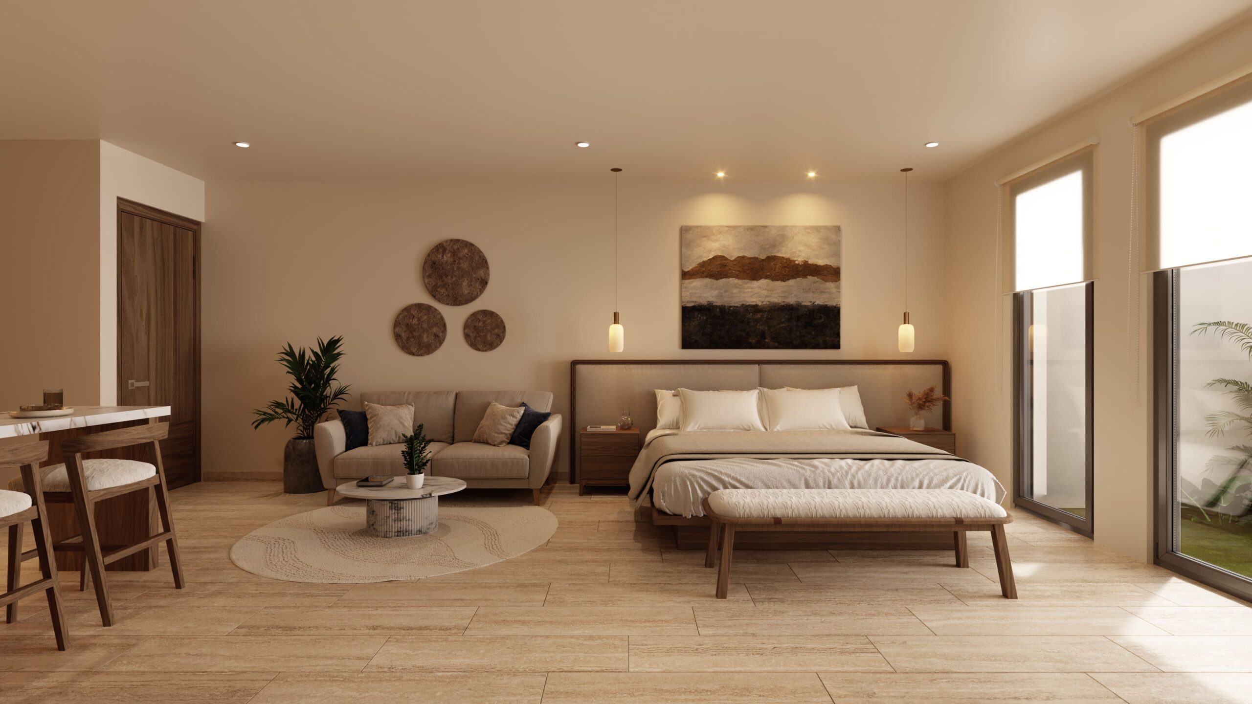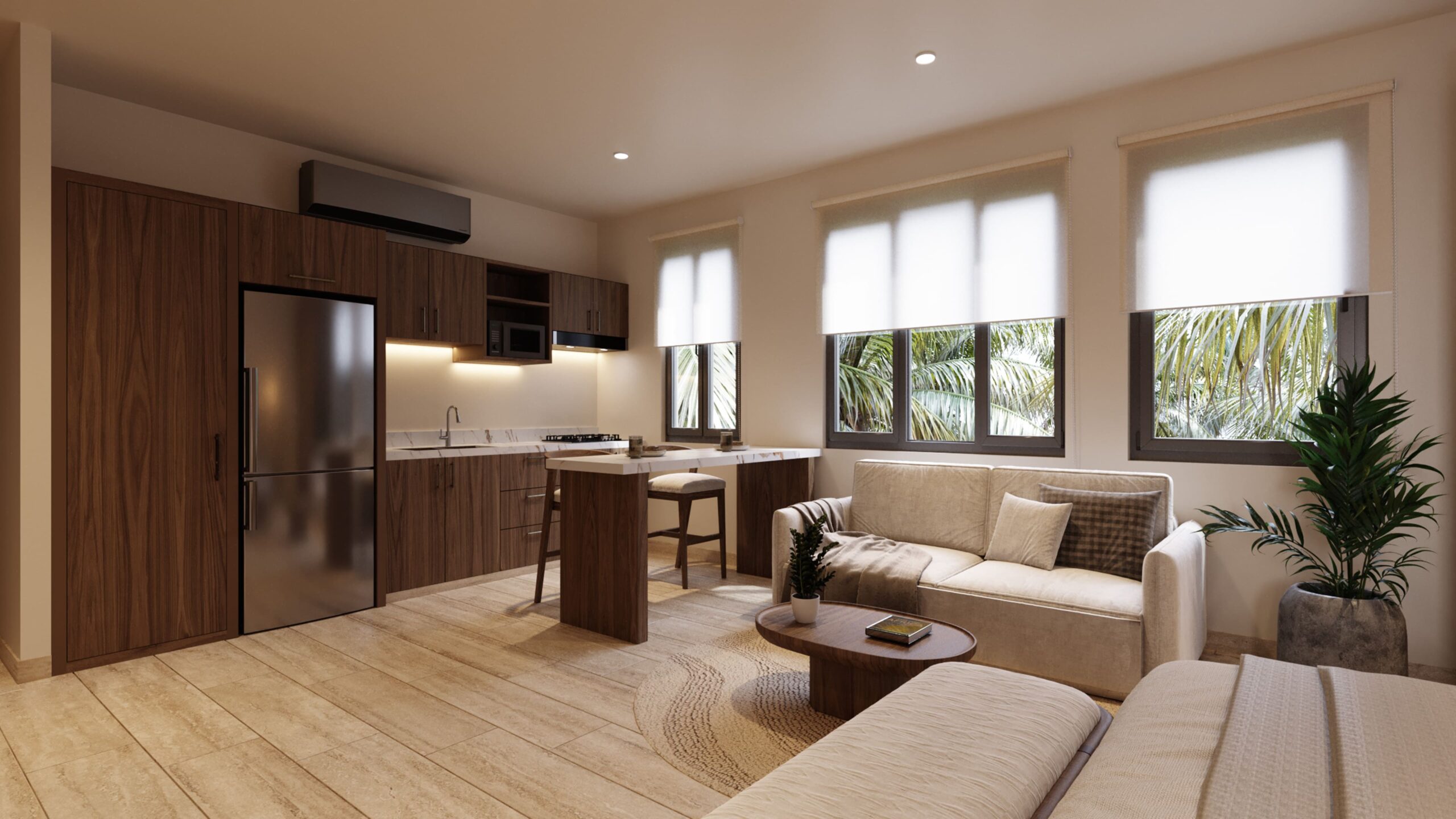 Each 43 m² studio is thoughtfully designed to maximize space and comfort, blending contemporary style with practical living in one of the most sought-after areas of the Riviera Maya.