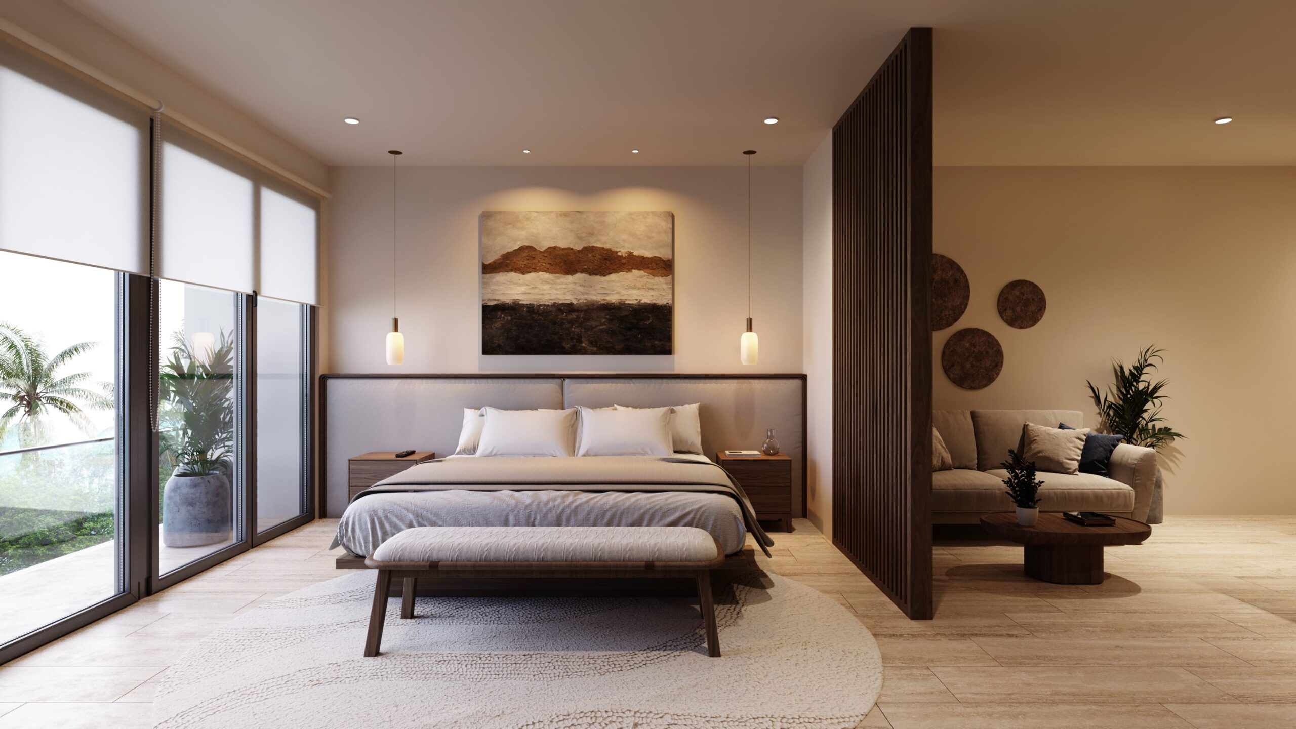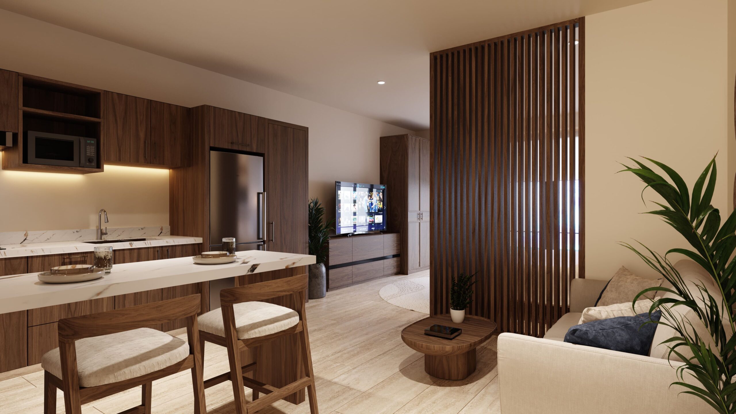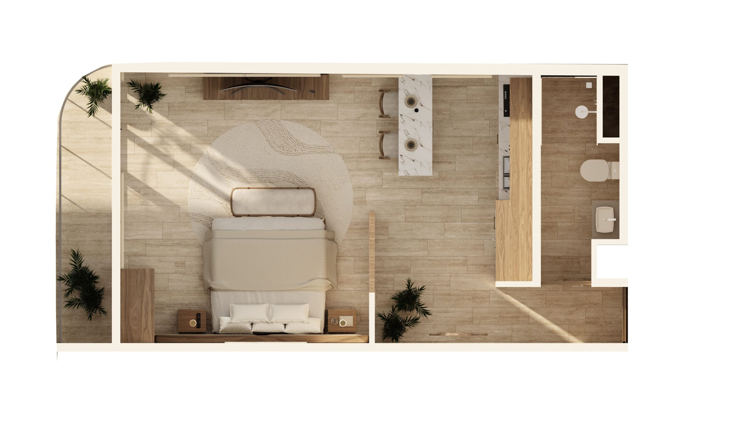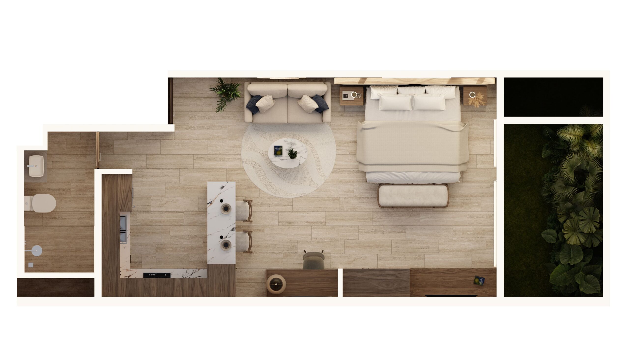 Each 43 m² studio is thoughtfully designed to maximize space and comfort, blending contemporary style with practical living in one of the most sought-after areas of the Riviera Maya.