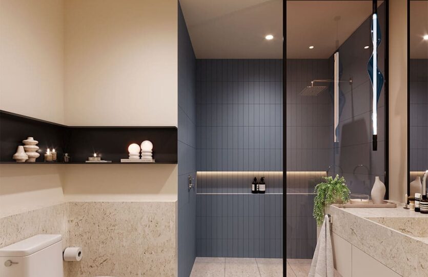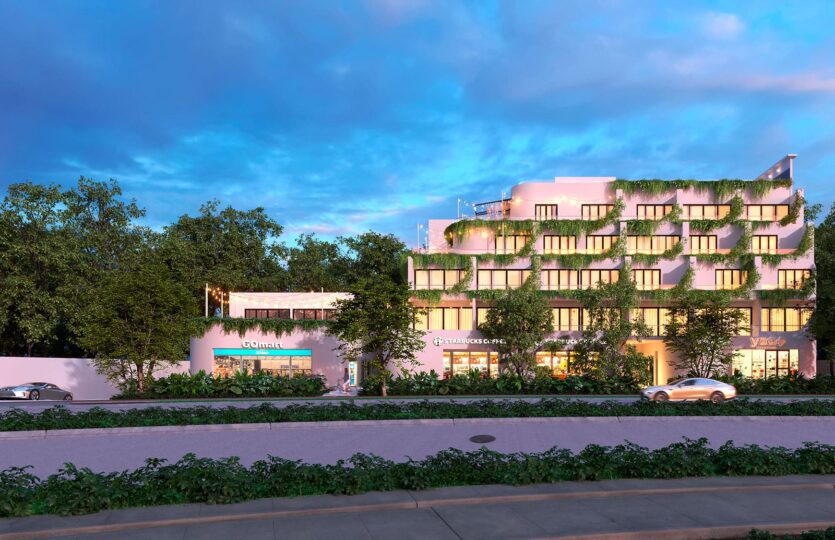 The project features a five-story design with a commercial ground floor that includes 10 retail spaces, and 21 one- and two-bedroom apartments distributed across the upper levels. A rooftop amenity space crowns the development, offering a relaxed and elevated perspective of its surroundings.