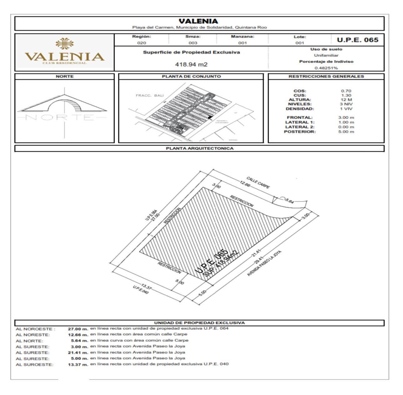 Located in the private Valenia Club Residencial, Lot 65 offers a generous 418.94 m² of residential land in one of Playa del Carmen’s fastest-growing areas. Perfect for building your custom home or securing a long-term investment.